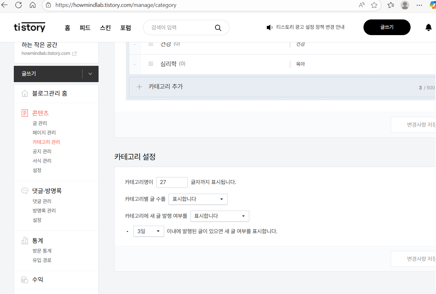 - ‘카테고리 관리’에서 필요한 카테고리만 남기고, 불필요한 것은 숨김/삭제