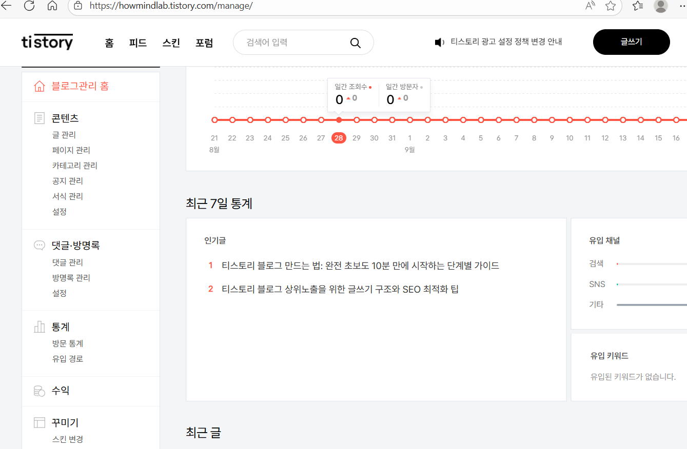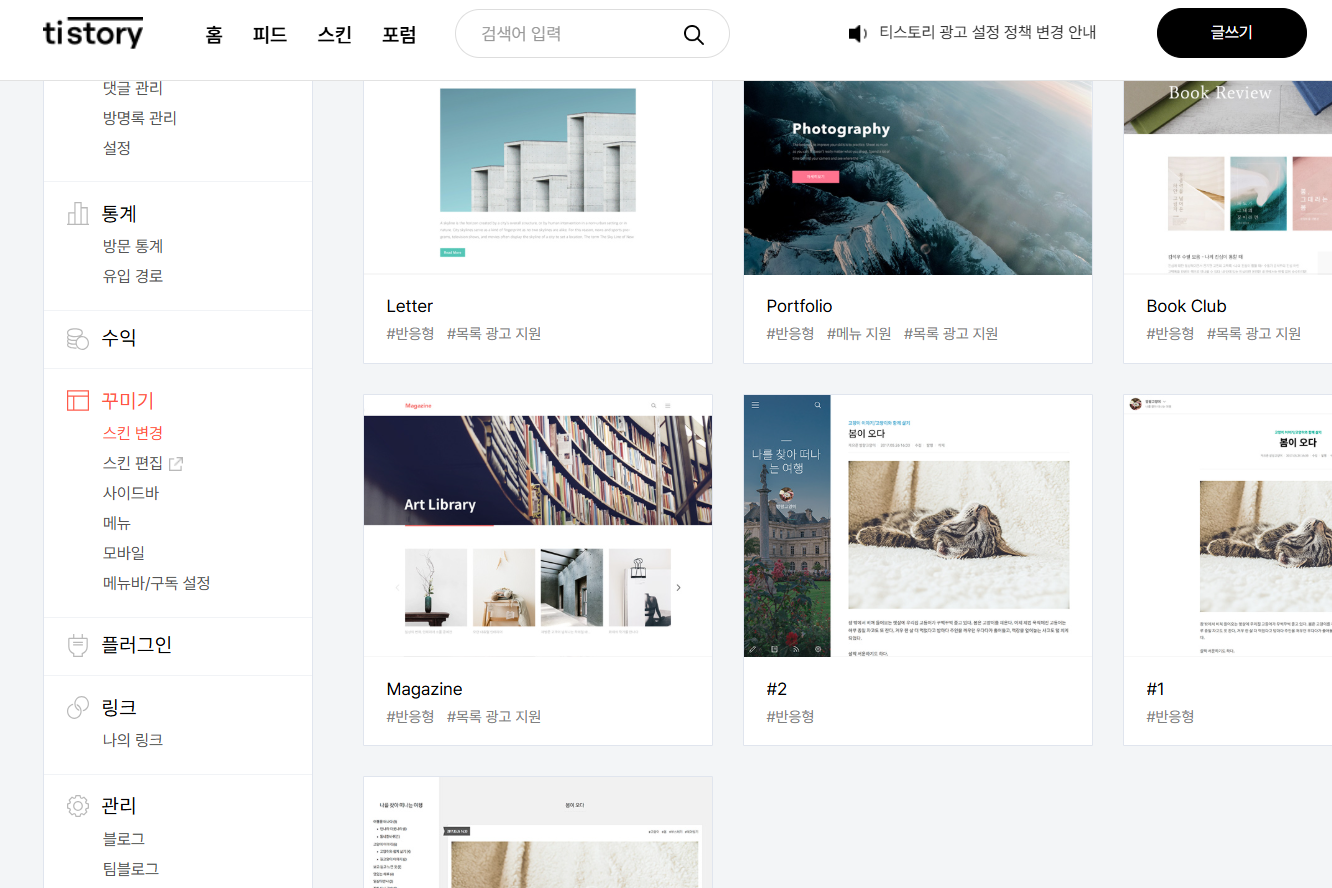 - 티스토리의 첫 화면은 ‘스킨(디자인)’에 따라 다르게 보일 수 있어요.